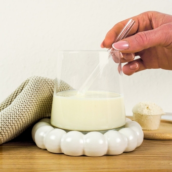 2 gehäufte Esslöffel (20 g) in 250 ml fettarmer Milch oder einem anderen fettarmen Milchprodukt einrühren oder im Shaker aufschütteln.