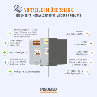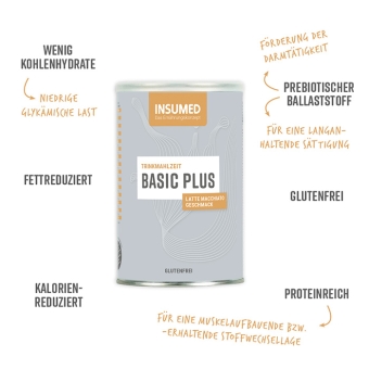 Der überdurchschnittlich hohe Anteil an prebiotischem Ballaststoff in den BASIC PLUS Trinkmahlzeiten, bewirkt eine noch bessere Sättigung und Förderung der Darmtätigkeit. Sie enthalten besonders wenig Kohlenhydrate, um den Anstieg des Blutzuckers und die Insulinausschüttung noch geringer zu halten, wovon insbesondere Diabetiker profitieren. Der pflanzliche Ballaststoff Nutriose begünstigt die Aufnahme von Mineralstoffen und optimiert die Verdauung. Die Kombination der unterschiedlichen Proteine unterstützt den Stoffwechsel die Muskelmasse zu erhalten bzw. aufzubauen.