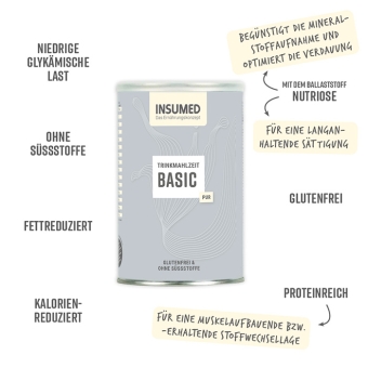 Die BASIC Trinkmahlzeit Pur ist ungesüßt mit neutralem Geschmack und wird auf Basis von Milcheiweiß hergestellt. Der langsame Anstieg des Blutzuckers nach dem Verzehr erleichtert den Abbau von Körperfett und fördert die Gewichtsreduktion. Der pflanzliche Ballaststoff Nutriose begünstigt die Aufnahme von Mineralstoffen, bewirkt eine langanhaltende Sättigung und optimiert die Verdauung. Die Kombination der unterschiedlichen Proteine sorgt für einen muskelaufbauenden bzw. muskelerhaltenden Stoffwechsel.