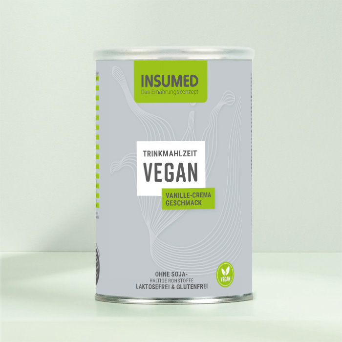 Die Trinkmahlzeit VEGAN ohne Soja wird auf Basis von Erbsen, Sonnenblumen-, Kürbisprotein hergestellt und ist laktose- und glutenfrei. Der neue Shake ist frei von Lupinen-Eiweiß und eine gute Alternative für Veganer. Durch den geringen Fettgehalt und die niedrige Insulinantwort nach dem Verzehr wird der Abbau von Körperfett erleichtert und die Gewichtsreduktion gefördert. Der pflanzliche Ballaststoff Nutriose begünstigt die Mineralstoffaufnahme und optimiert als Präbiotikum die Verdauung. Die Kombination der unterschiedlichen Proteine sorgt für eine muskelaufbauende bzw. muskelerhaltende Stoffwechsellage.