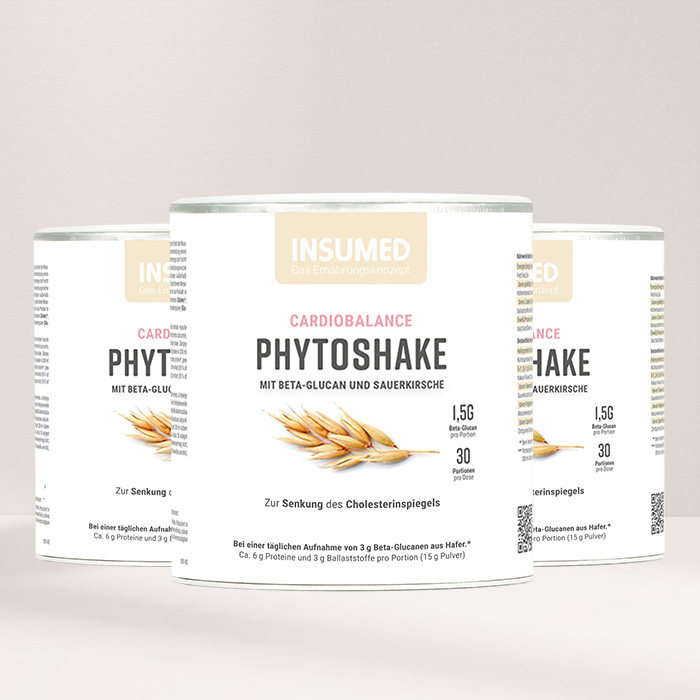 Der INSUMED PHYTOSHAKE Cardiobalance beinhaltet sekundäre Pflanzenstoffe wie Beta-Glucane aus Hafer, Polyphenole aus der Sauerkirsche, Flavinoide aus Kakao und Spermidin aus Weizenkeimpulver. Er enthält außerdem eine ballaststoffreiche und pflanzliche Proteinkombination aus Hafer- und Kürbisprotein.
